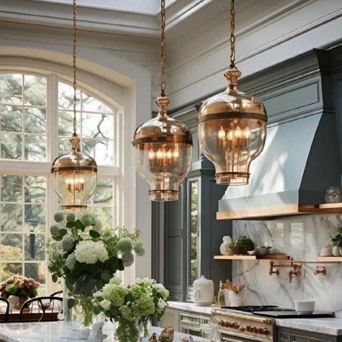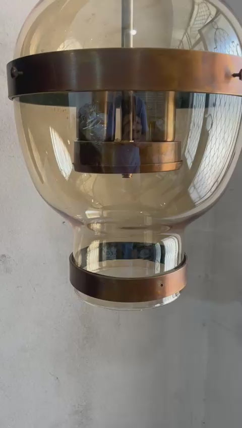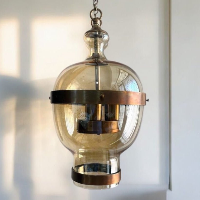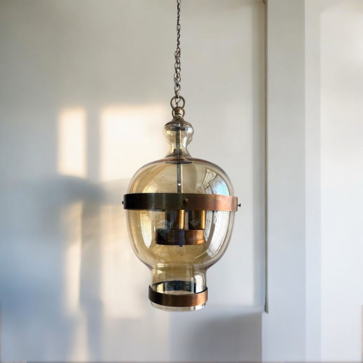 The subtle amber tint softens the light, while aged brass bands provide structure and contrast—wrapping the glass like a protective frame. Suspended by a sturdy chain, it's a striking balance of fluid form and solid detail. Perfect for entryways, dining spaces, or anywhere that calls for a piece with quiet strength and artisanal depth.