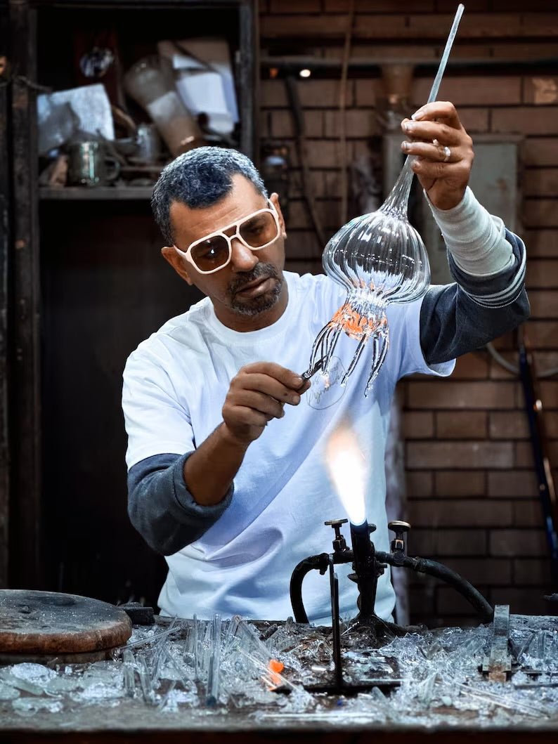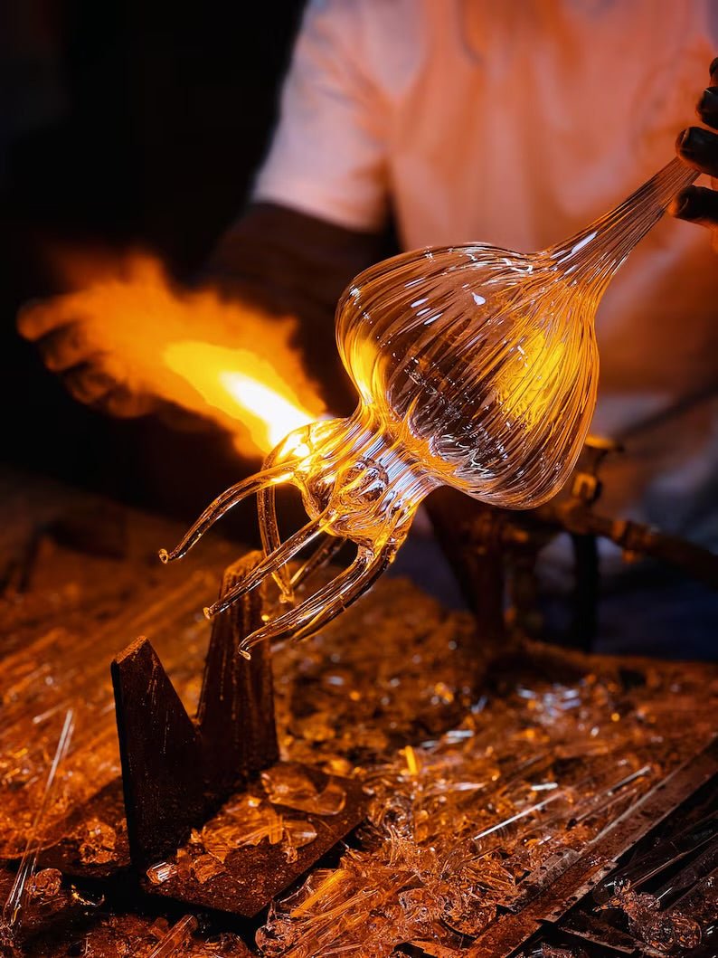 This jellyfish-inspired wall sconce is more than a light β it is a true piece of art. Entirely hand-blown from clear glass, every curve of the dome and each flowing tentacle is shaped with extreme precision and patience. Creating this design takes many hours of careful craftsmanship, as the delicate glass tentacles must be formed individually and then seamlessly joined to the body.