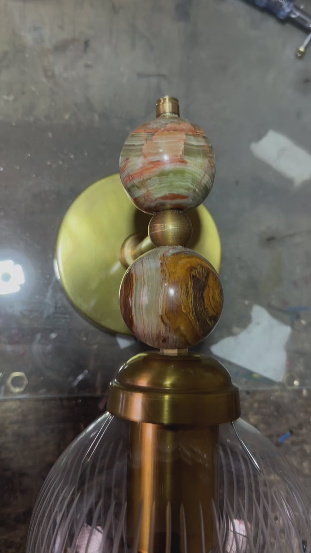 This handcrafted wall light sconce combines natural marble, brass, and ribbed glass for a refined yet organic look. The fixture features two polished marble spheres with earthy tones and unique veining, adding warmth and texture. A brushed brass arm and base provide a timeless contrast, while the ribbed glass globe diffuses light softly, creating an inviting ambiance. Ideal for hallways, bedrooms, or accent lighting, this piece blends elegance with artisanal craftsmanship.