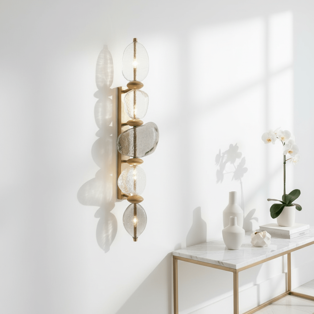 The irregular glass elements form a gemstone-like surface that interacts naturally with light, creating subtle reflections and depth rather than direct glare. Due to the handmade and upcycled nature of the materials, every wall lamp is unique in texture and arrangement.