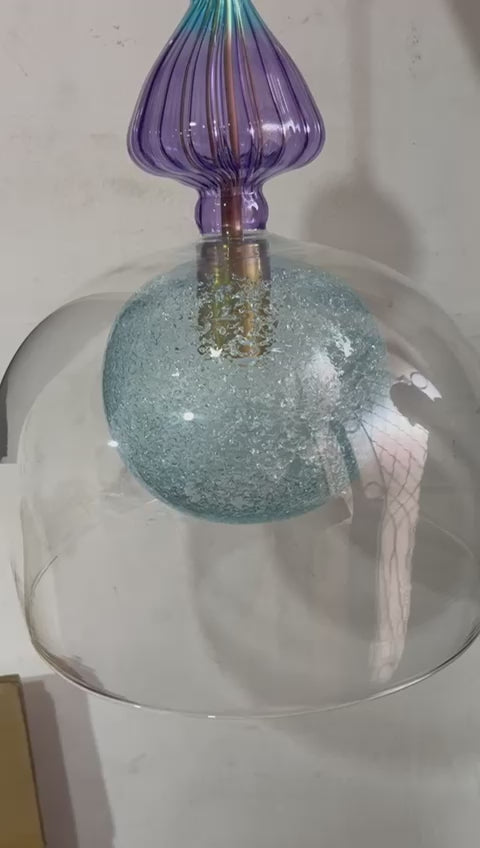 Blending blue, purple, and clear glass to create an eye-catching centerpiece. The intricate craftsmanship of the stacked design, with its clear glass dome and textured inner bulb, makes it perfect for adding artistic flair and bright illumination to any kitchen, dining room, or living area. Customize the pendant’s color scheme through the personalization box, choosing from an array of hues to perfectly match your space and style.