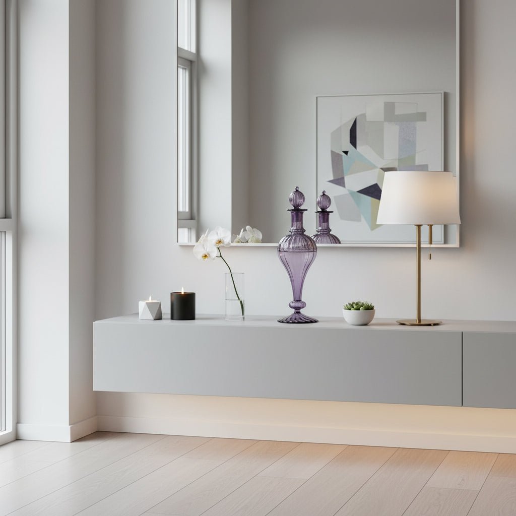 Hand-Blown Lavender Glass Decanter – Ribbed Vintage-Inspired Decorative Art Glass Bottle