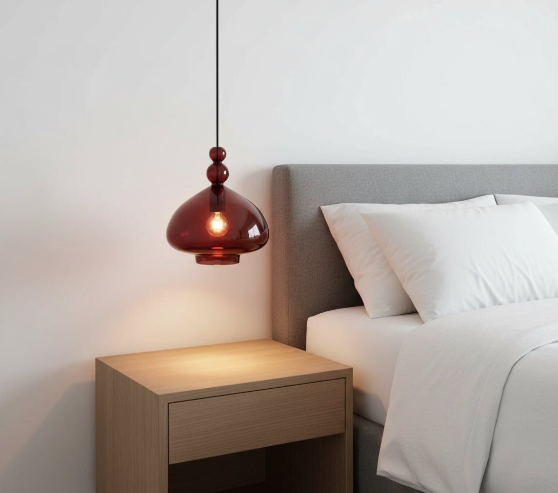 This hand-blown red glass pendant features a smooth dome shade paired with small rounded glass beads above the light. The warm red tone creates a soft ambient glow, making it ideal for kitchens, bedrooms, and hallway lighting. Each piece is handmade with natural variations in shape and color.