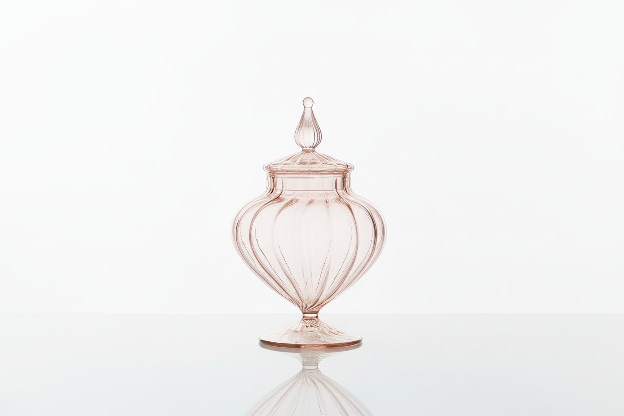 Hand Blown Ribbed Glass Candy Jar with Lid โ Blush Pink Storage Container