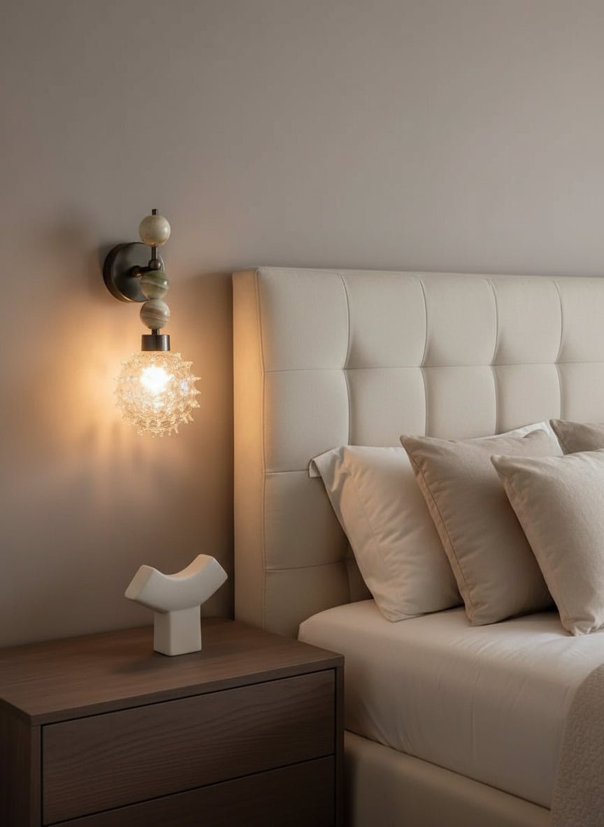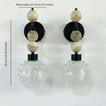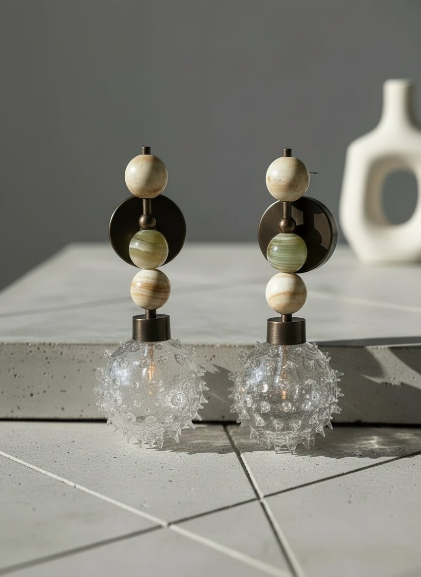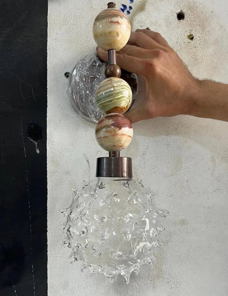 Handmade wall light made with natural onyx spheres, a dark bronze structure, and hand-textured bubble glass. Each piece showcases unique stone patterns and soft, warm illumination, creating a refined focal point for modern and classic interiors.