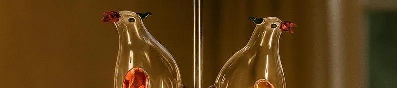 Featuring two delicately sculpted glass birds facing opposite directions, this pendant light is a perfect blend of nature-inspired aesthetics and contemporary design. Each bird is hand-blown with transparent glass, accented with rich, colorful details on the beak, tail, and wings, creating a unique and eye-catching effect when illuminated.