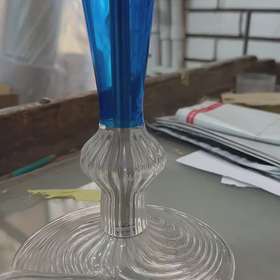 A tall, elegant hand-blown glass lamp made with care and precision. The transparent blue glass base stands gracefully on a clear foot, topped with a ribbed glass shade that beautifully diffuses light and adds a refined handmade character to any space.