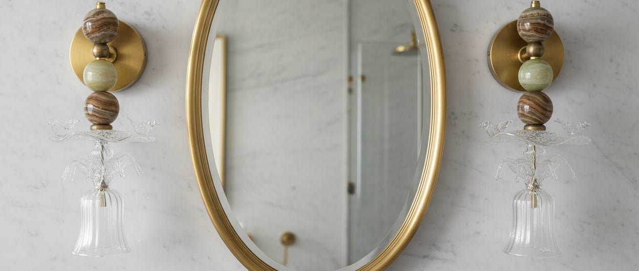 Handcrafted wall sconce designed to bring artisan craftsmanship into refined interiors combining natural onyx stone brass and handblown glass