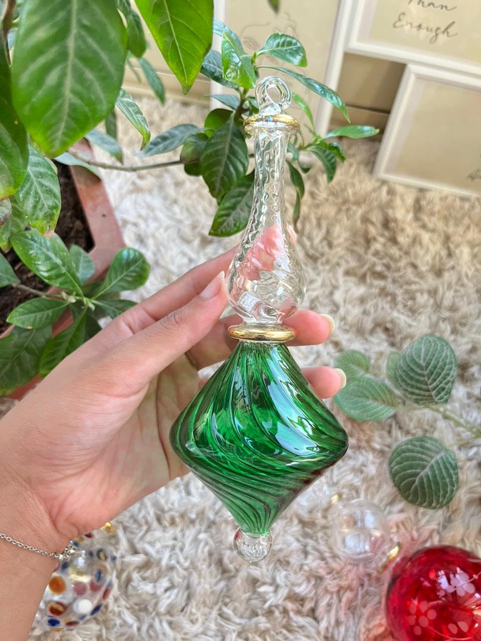 Bring the magic of Egyptian artistry to your holiday decor with this handmade green glass ornament by Les Trois Pyramides. Crafted by skilled artisans in Egypt, each piece is unique and full of character — perfect for Christmas trees or as a thoughtful handmade gift.