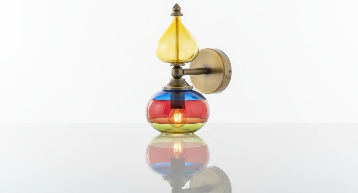 This handcrafted wall fixture features a hand-blown glass shade paired with a brass-finished frame, creating a warm and balanced lighting piece. The glass is shaped by hand and softly diffuses light, while the brass structure adds a refined architectural presence.