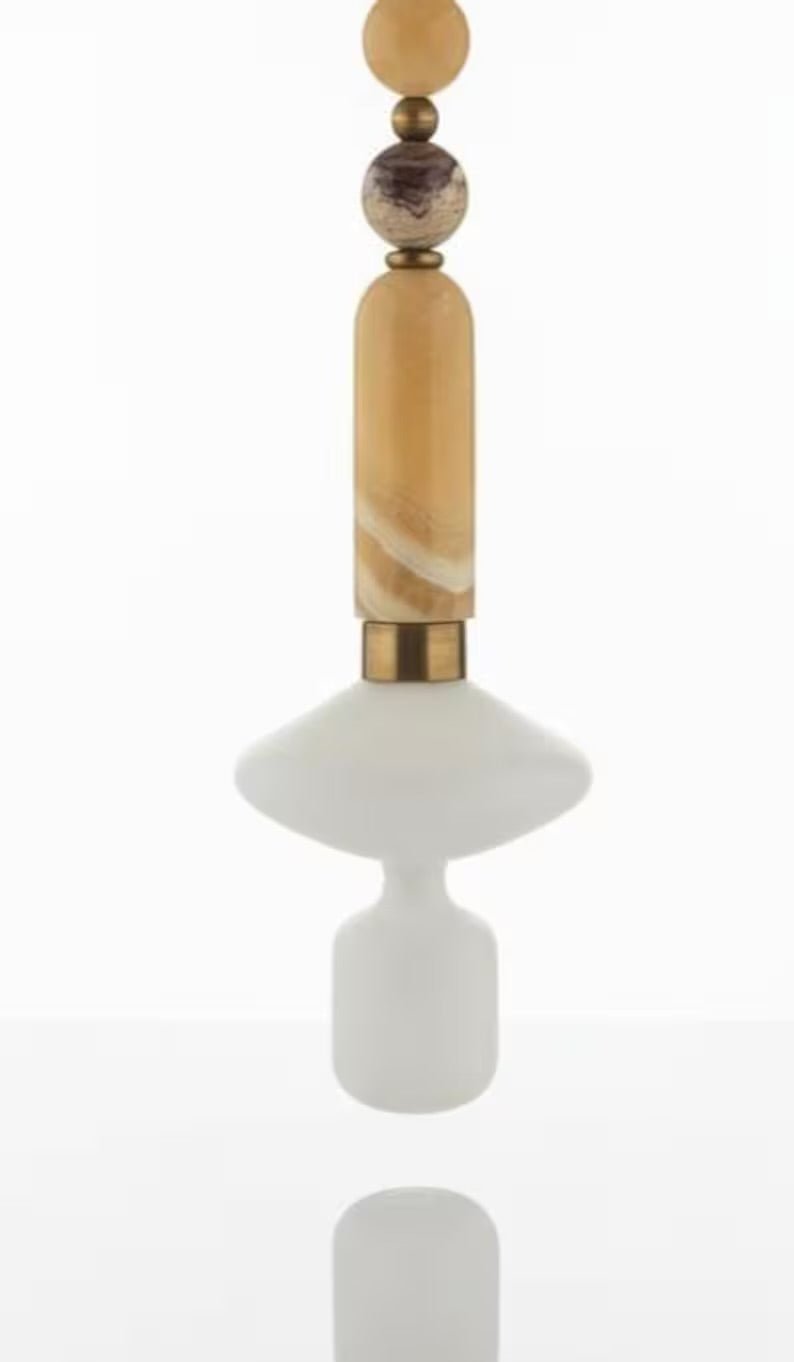 This handcrafted pendant features a natural onyx stone paired with a frosted glass shade, creating a soft, diffused glow. The contrast between the solid stone and the Frosted glass gives the piece a refined, modern presence.