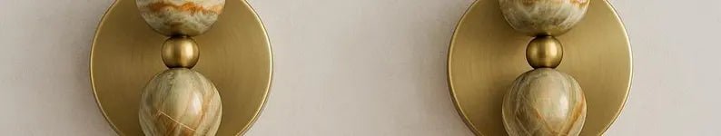 Bring warmth and craftsmanship into your home with this set of two handmade wall sconces, combining natural onyx stone, solid brass, and blown glass. Each piece is handcrafted with care — no machines involved — ensuring subtle variations that make every light truly one of a kind.