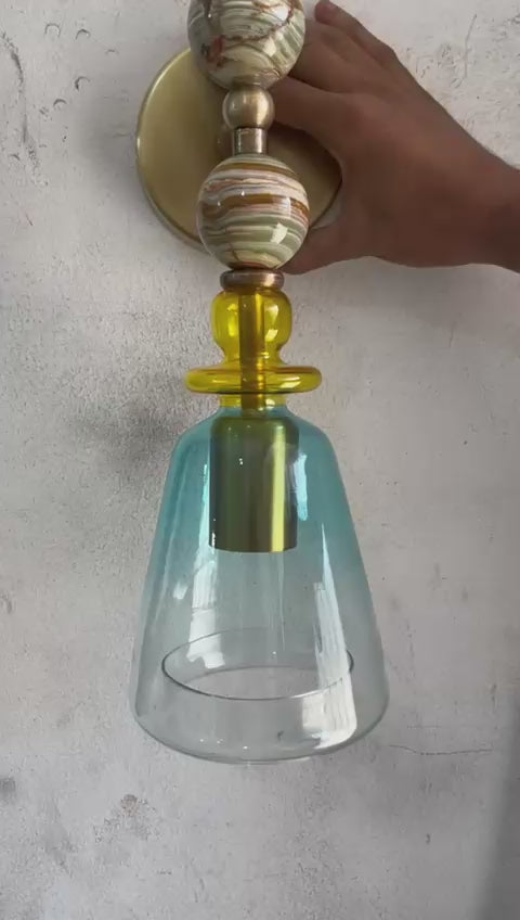 This handmade wall sconce combines warm brushed brass with natural onyx stones and a two-tone glass shade for a refined, modern look. The layered design features rounded onyx accents, a golden amber glass detail, and a softly tapered shade that transitions from teal to clear. Each component is handcrafted, giving the piece its own character and subtle variations. Ideal for bedrooms, living areas, or hallways, this sconce adds a contemporary artistic touch to any interior.