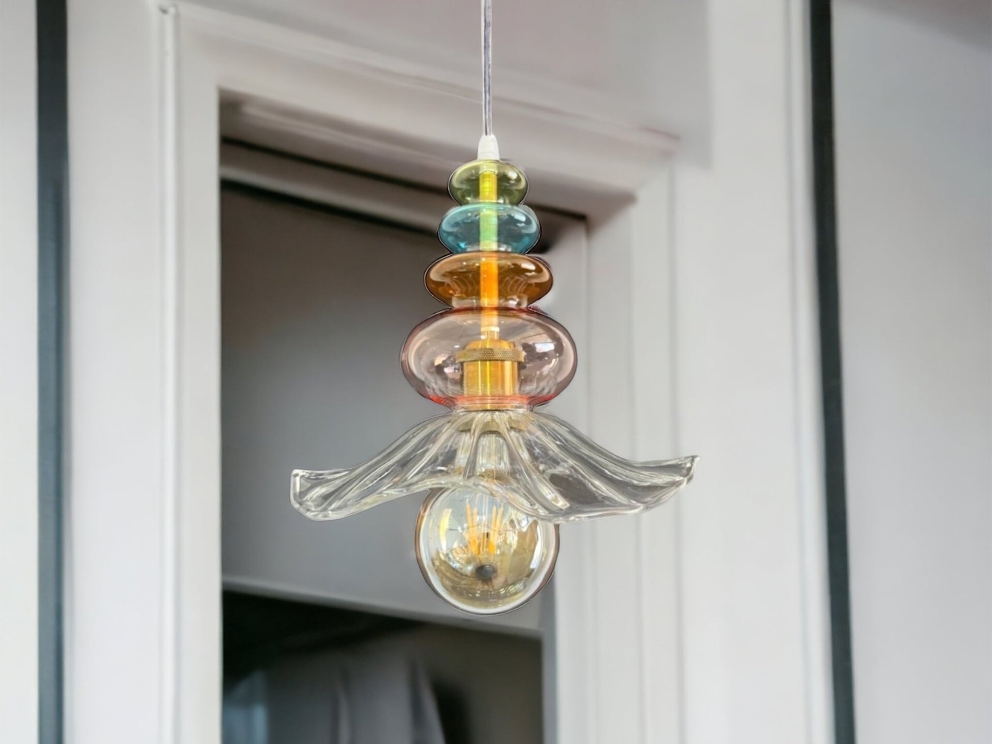 Add a touch of whimsy and artistry to your space with this stunning hand-blown glass pendant light. Featuring a delightful mix of colors, including orange, green, pastel blue, and warm rose hues, it captures the eye with its unique layered design. The delicate, petal-shaped clear glass shade adds a sculptural elegance, making this piece a perfect focal point for kitchens, dining areas, or cozy nooks.