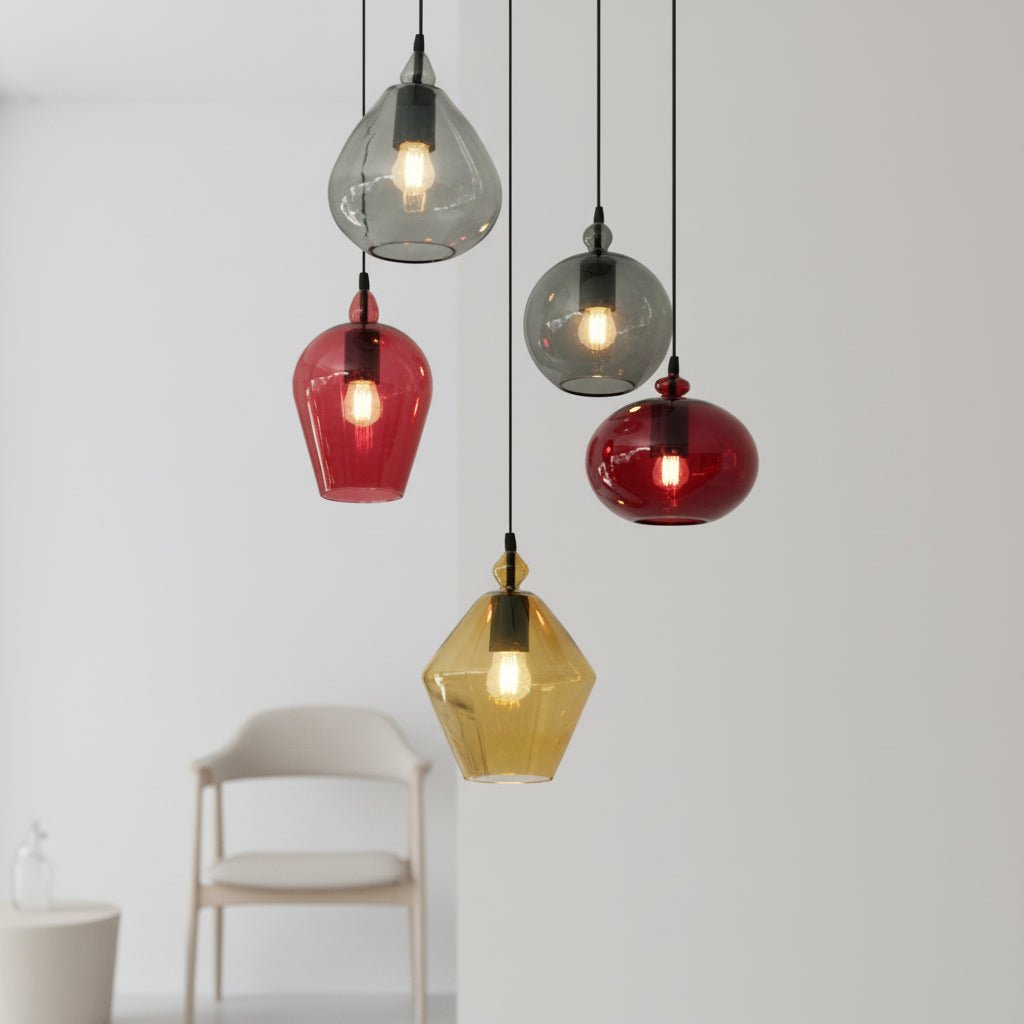 The Set of 5 Handmade Fruity-Shaped Multicolored Hanging Lamps brings a vibrant and artistic touch to any dining space. Inspired by the organic forms of fruits, each pendant features a unique shape and a bold color palette, including rich reds, warm ambers, and deep smoky greys. Handcrafted from premium blown glass, these pendants beautifully diffuse light, creating a warm and inviting atmosphere. Suspended at varying heights, they add depth and movement to the design, making them a striking focal point for dining rooms, kitchens, or modern living spaces.