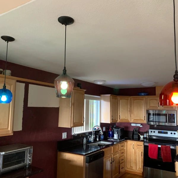 The vibrant colors and unique design make these pendants perfect for decorating your space. The adjustable cords allow you to create a gradual look, making them the perfect addition to any bar or kitchen lights.
